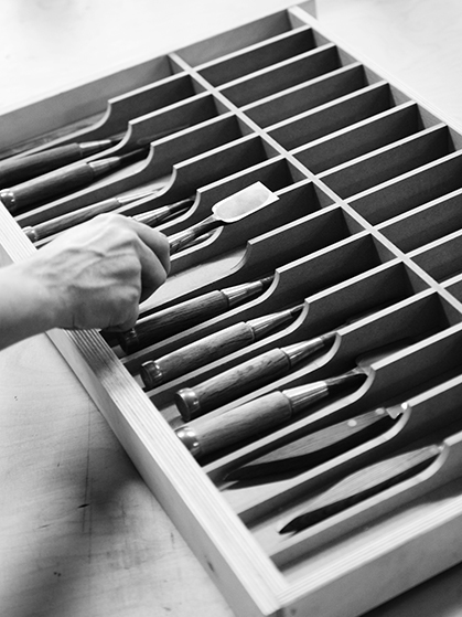 Arvostamme taidokkaita yksityiskohtia ja perinteisiä puunkäsittelymenetelmiä, mutta myös moderneja tekniikoita. Käytämme oikeita materiaaleja oikeissa paikoissa ja hyödynnämme nykyaikaisia puuntyöstökoneita. Jokainen työvaihe kunnioittaa jopa vuosisatojen ajan luonnossa kasvanutta puuta sen jatkaessa elämäänsä arvohuonekaluissa. Puun hengen ja luonteen voi aistia kalusteissamme vielä vuosikymmenten päästä.